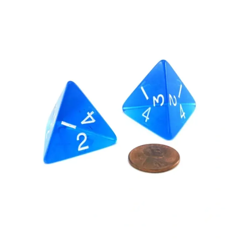 These 4 sided triangular jumbo 26mm dice are numbered 1 to 4 with numerals etched into the surface of the dice and painted white. The bottom number is used on a roll.