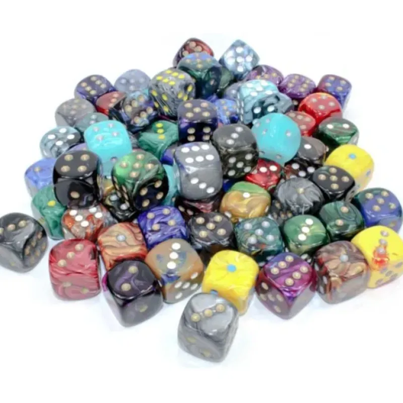 This pack of 72 dice is one of the best deals around for a great selection of unique Chessex 20mm dice. Included in the pack is 2 of 36 different styles and colors. The dice are larger than more standard sized 16mm dice, and have well etched and painted pips. Included are a variety of Cirrus, Festive, Leaf, Lustrous, Phantom, Scarab, Velvet, Vortex, and Gemini Dice.
