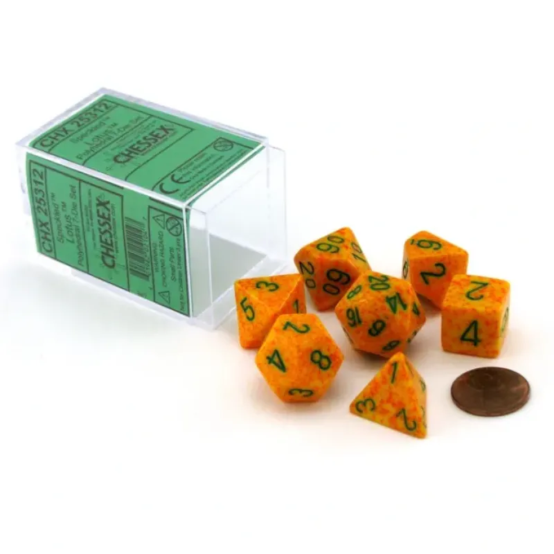 Speckled dice look, feel, and roll well and will be a great addition to any game or collection. All dice read from the top for easy comprehension. Sharp edges allow for easy shape recognition and the numbers are about as large as possible on each face. This polyhedral set contains one D20, one D12, two D10 (00-90 and 0-9), one D8, one D6, and one D4.