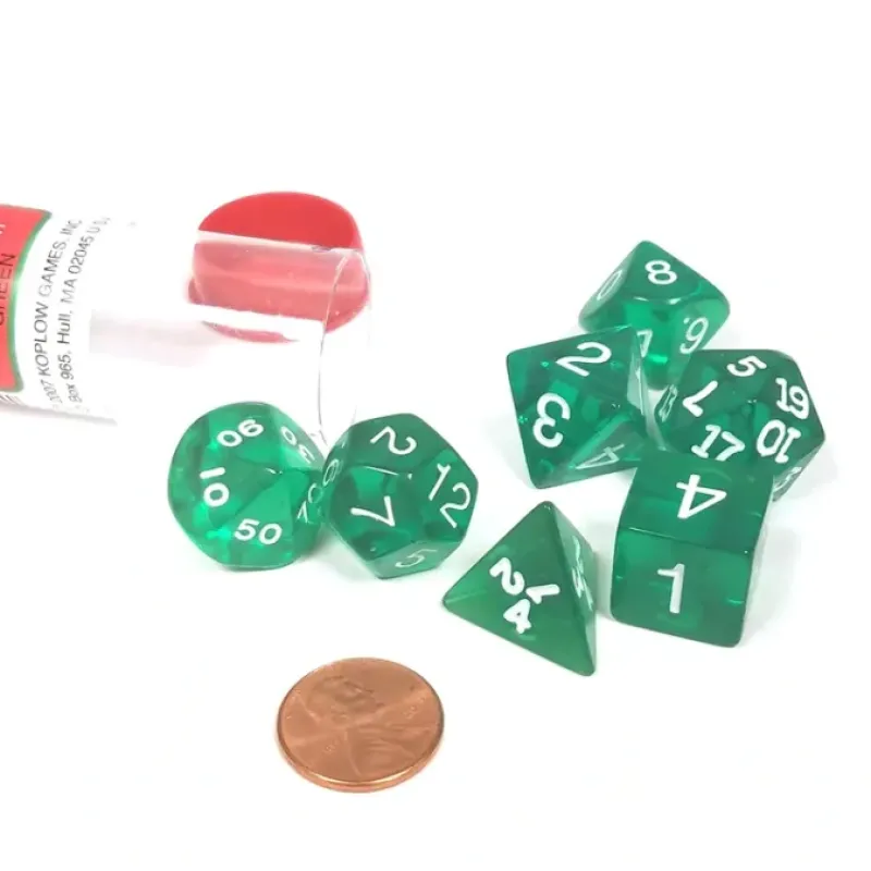 This 7-dice polyhedral set looks, feels, and rolls well and will be a great addition to any game or collection. All dice read from the top for easy comprehension. The numbers are etched into the surface and painted. This polyhedral set contains one D20, one D12, two D10 (00-90 and 0-9), one D8, one D6, and one D4. Set comes in a clear plastic tube with removable red cap which can be used for storage and travel. The 6 and 9 have decimals in the lower right corner of their respective sides to help differentiate the two numbers.