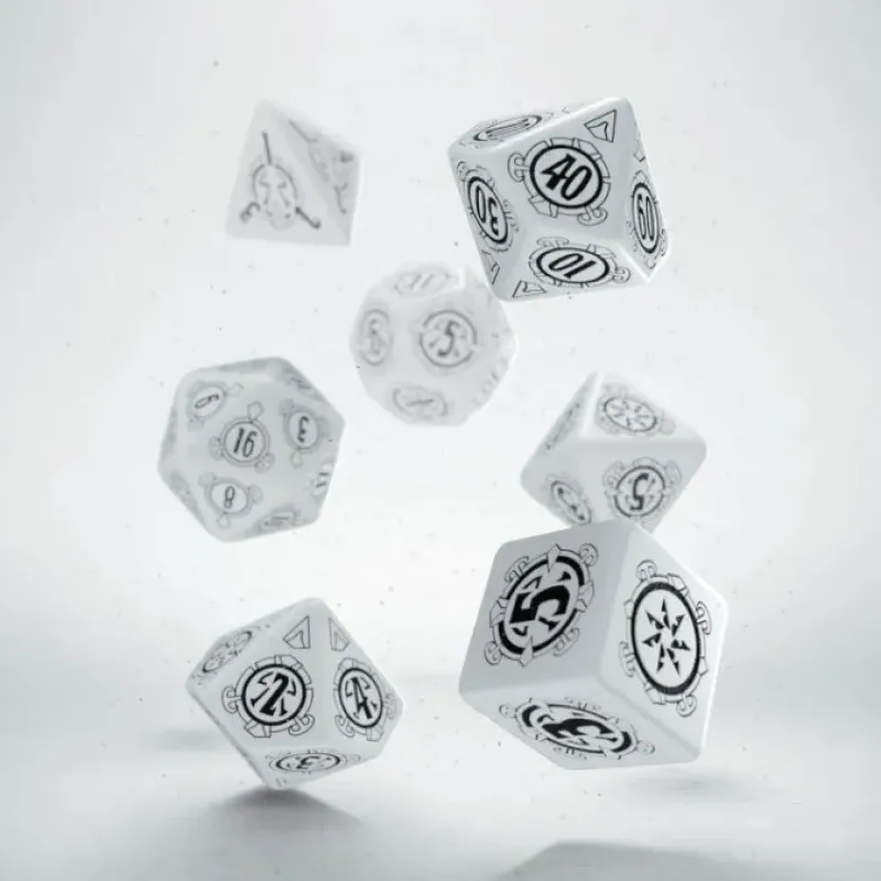 Set of 7 polyhedral white opaque with black dice. Each of these dangerous dice bear markings suggestive of ancient empires and lost magic. Roll the dice and face your doom!