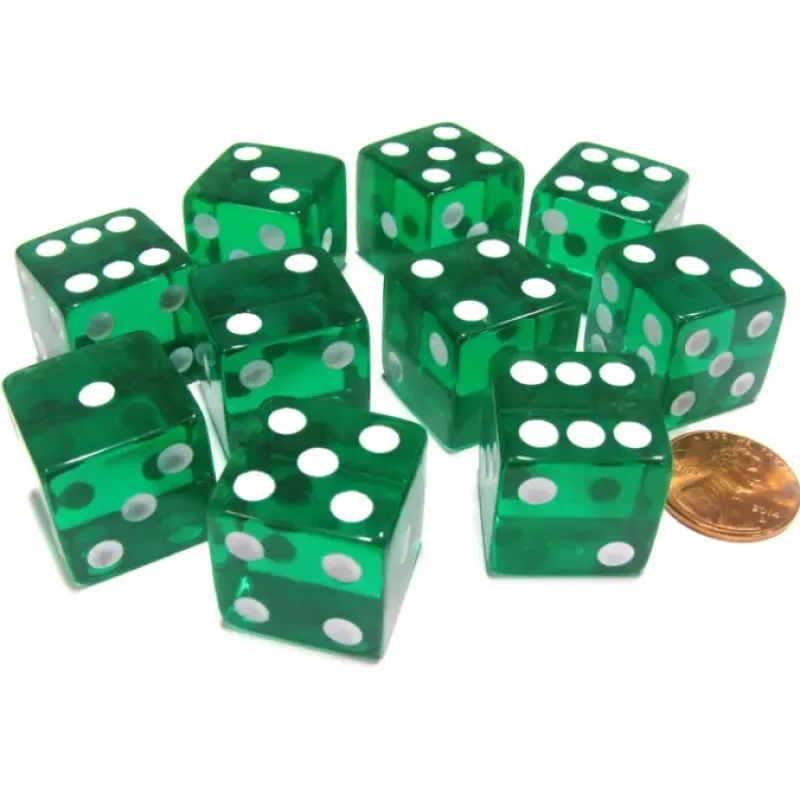 Dice>Set of 10 D6 Square Edged 19mm Dice - Transparent Green with White Pips - Your Source for Gaming Essentials