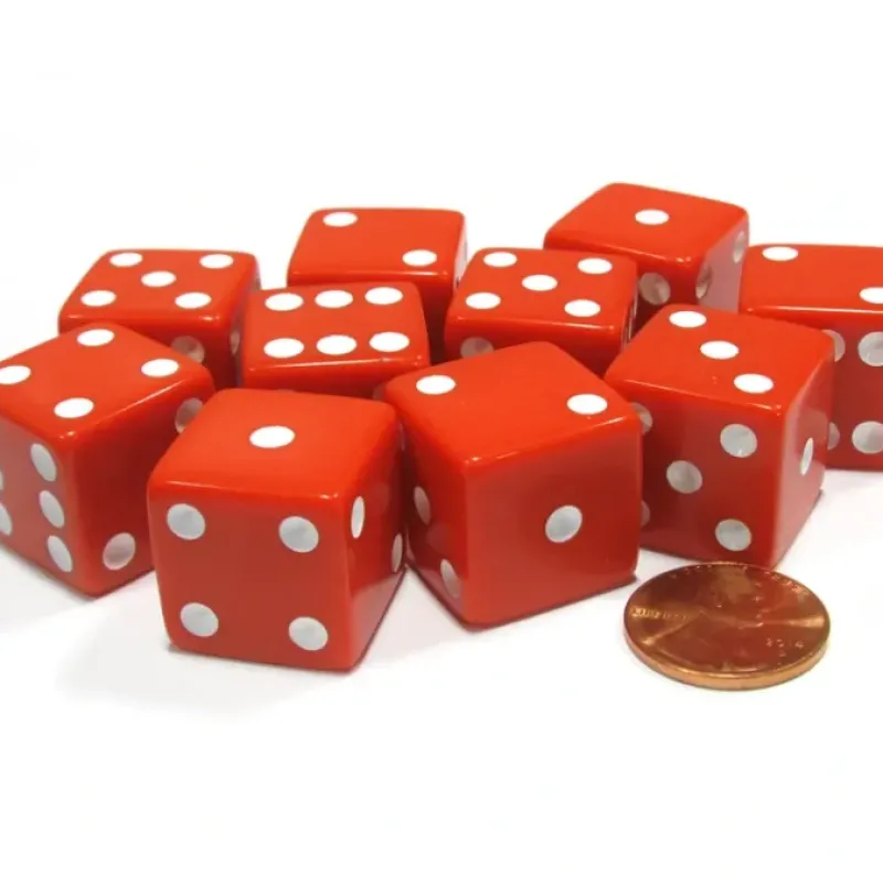 These 19mm red dice have a great look, feel, and roll. They are numbered 1 to 6 with traditional dice pips, spots, etched into the surface of the dice and painted white. Use these dice to play your favorite dice and board games or create your own game. 19mm dice are a bit larger than what is considered standard sized 16mm dice. Purchase includes 10 red with white pip dice enclosed in a plastic resealable bag.