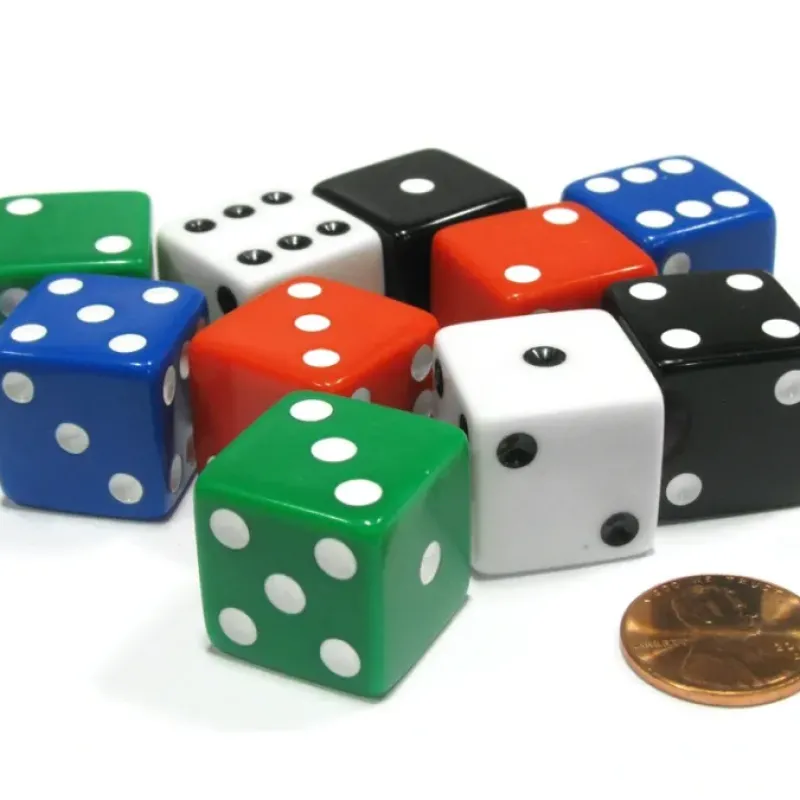 These 19mm red, white, blue, black, and green dice have a great look, feel, and roll. They are numbered 1 to 6 with traditional dice pips, spots, etched into the surface of the dice and painted black or white. Use these dice to play your favorite dice and board games or create your own game. 19mm dice are a bit larger than what is considered standard sized 16mm dice. Purchase includes 2 of each color dice enclosed in a plastic resealable bag.