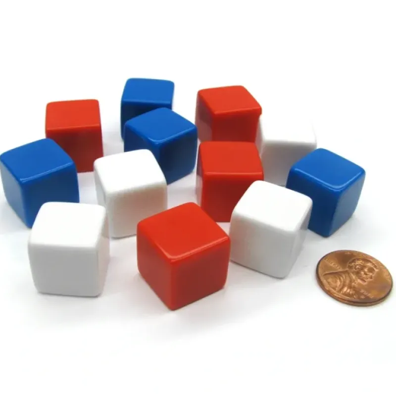 Create your own dice with these 6-sided 16mm tall blank dice. Use stickers (not included), write directly on the dice, or use whatever your imagination can come up with and write numbers, letters, points, characters, words, or whatever you like on the stickers – the options are unlimited! The 10 dice come enclosed in a plastic bag including 4 dice in red, 4 dice in white, and 4 dice in blue. Great for educational games, dice games, board games, RPG games, and friends and family fun!
