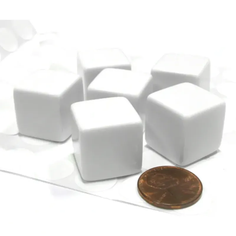 Create your own dice with these 19mm blank dice. A sheet of 77 circular white stickers is included that can be used to create your unique dice. Write numbers, letters, points, characters, words, or whatever you like on the stickers – the options are unlimited! The 6 dice and sticker sheet come enclosed in a convenient plastic re-sealable reusable bag. Great for educational games, dice games, board games, RPG games, and friends and family fun!