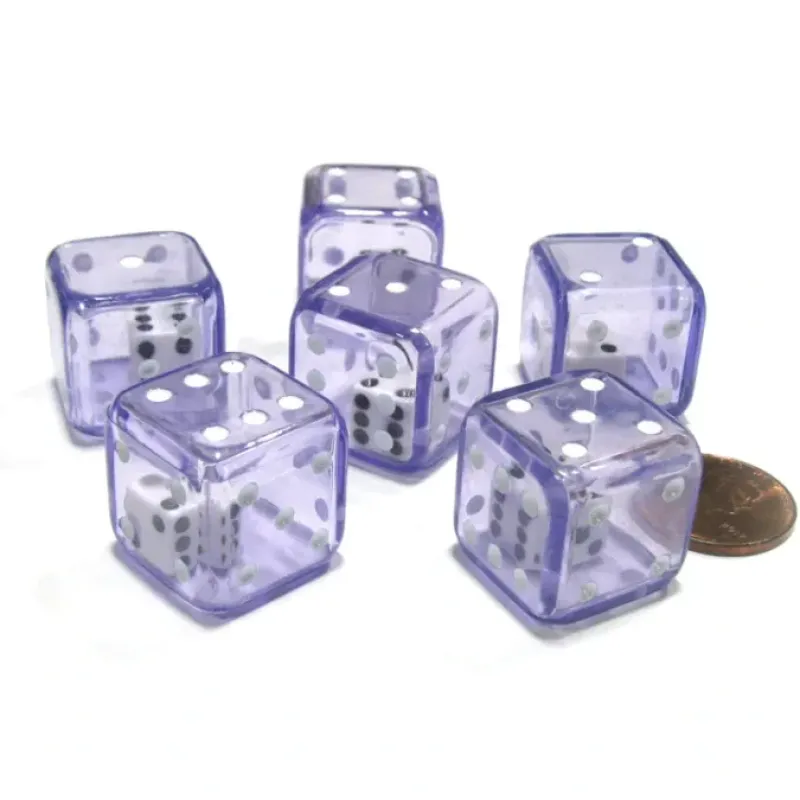 Turn 1 roll into 2 with these fun and unique D6 ‘double dice’. Both dice are numbered one to six with dice pips, spots, etched into the surface. The outer translucent die measures 19mm and holds an opaque 8mm die. The 6 double dice come in a resealable plastic bag which can be used for storage and travel. Great for educational uses, board and RPG games, and what ever your imagination can come up with!