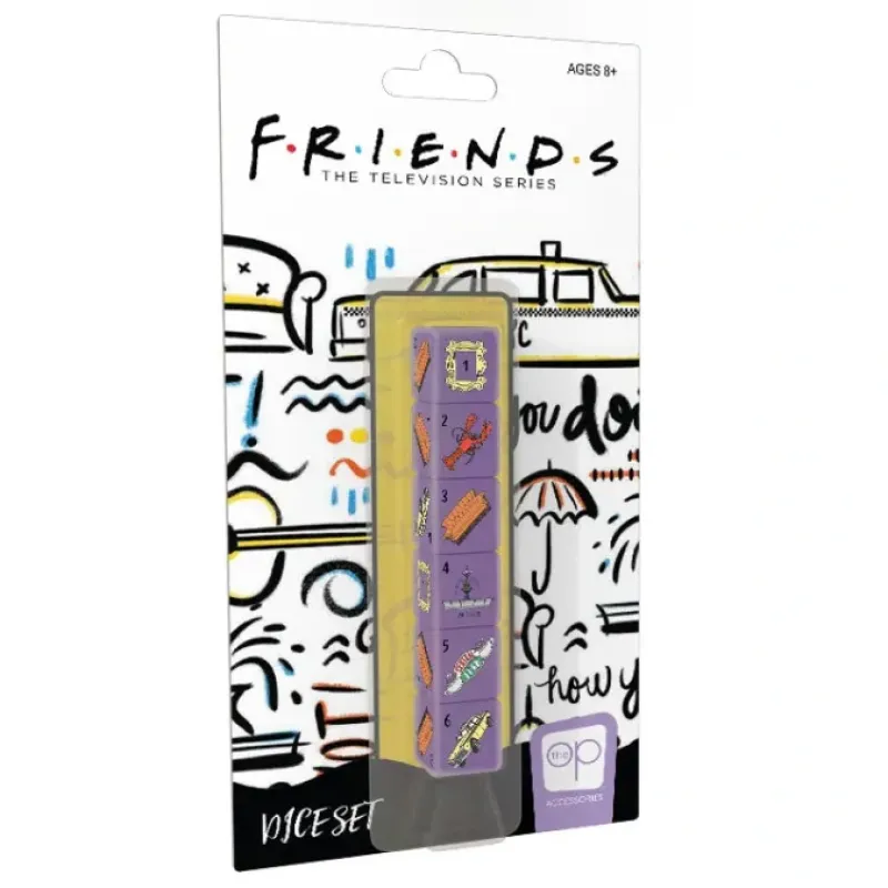 Take some mementos of friendship to your next game night with this Apartment 20-approved set of dice! This 6-sided dice set features illustrations of your favorite 90s comedy series props, including the peephole picture frame, life mate lobster, orange couch, fountain, Central Perk sign, and Phoebes taxi.