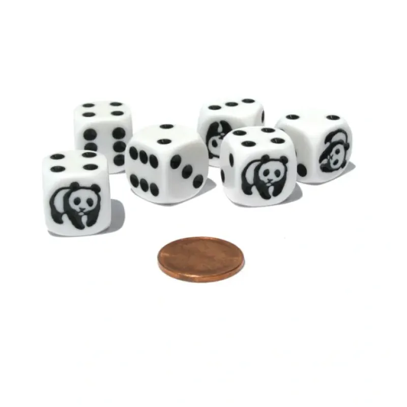 These 16mm panda dice have nice, smooth rounded-edges that make for a great feel and roll. They are numbered 1 to 6 with traditional dice pips, spots, etched into the surface of the dice and painted black. A panda is etched into the side where the 1 pip, the “ace,” would traditionally be located. Use these panda dice to play your favorite dice and board games or create your own game. 6 dice enclosed in a convenient small plastic resealable bag are included with this purchase.