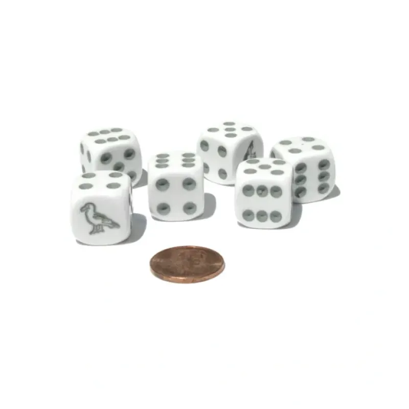 These 16mm seagull dice have nice, smooth rounded-edges that make for a great feel and roll. They are numbered 1 to 6 with traditional dice pips, spots, etched into the surface of the dice and painted gray. A seagull is etched into the side where the 1 pip, the “ace,” would traditionally be located. Use these seagull dice to play your favorite dice and board games or create your own game. 6 dice enclosed in a convenient small plastic resealable bag are included with this purchase.
