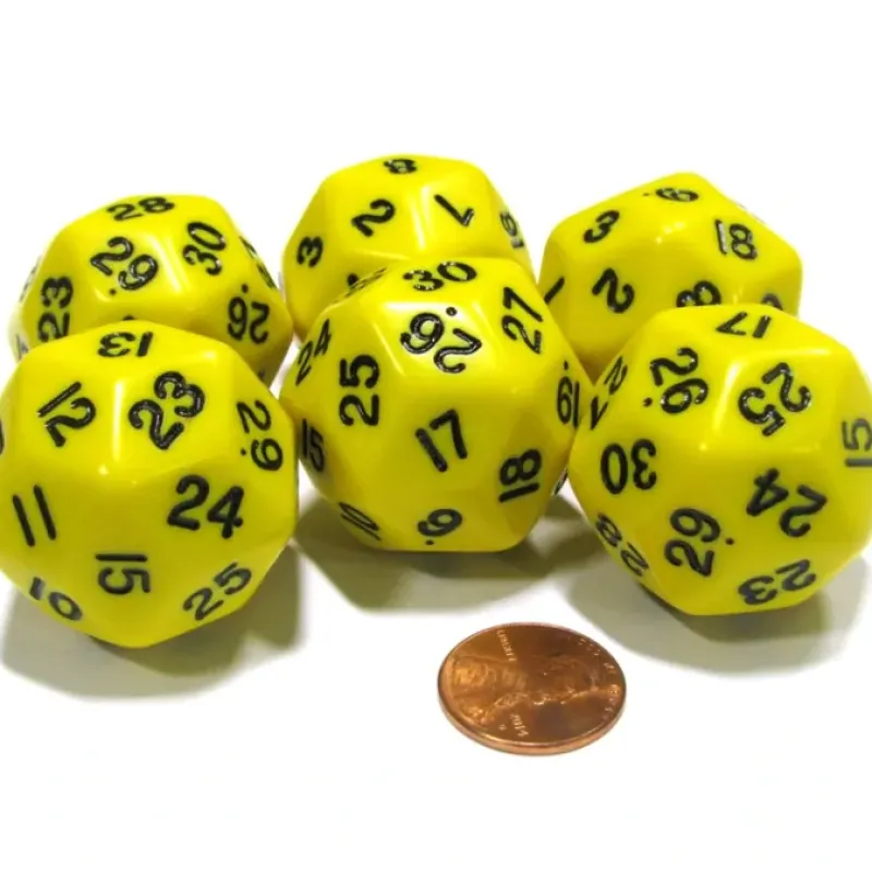Dice>Set of 6 Triantakohedron D30 30 Sided 33mm Jumbo Dice – Yellow w Black Numbers – Your Source for Gaming Essentials