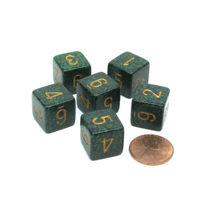 These 6-sided 15mm Speckled dice are numbered from one to six with numbers, not pips, and feel great in your hands. These dice are unique, good quality, and great for any dice game! Numbers are centered on each side and the 6 is underlined.