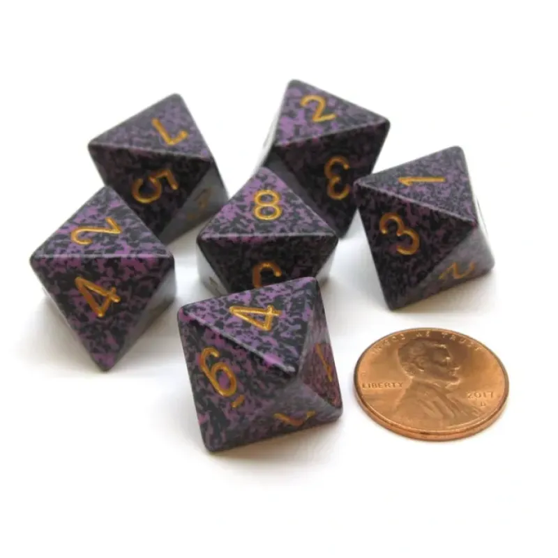 These 8-sided 15mm Speckled dice are numbered from one to eight with numbers, not pips, and feel great in your hands. These dice are unique, good quality, and great for any dice game! Numbers are centered on each side and the 6 is underlined.