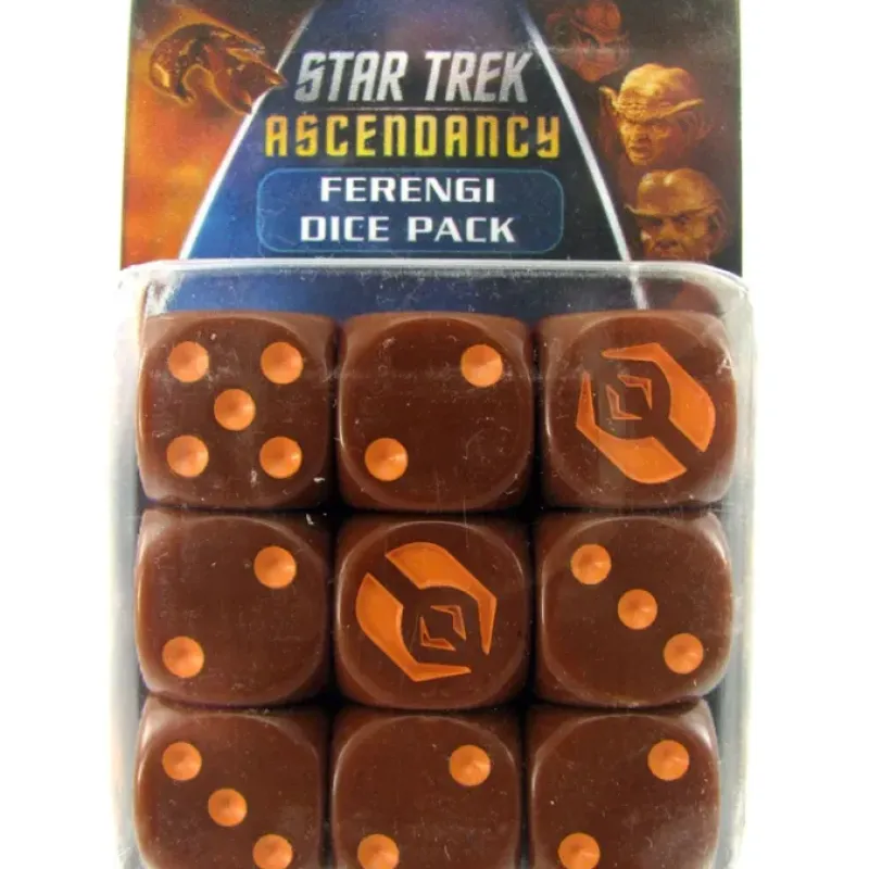 Upgrade your game of Star Trek: Ascendancy with custom dice! This pack includes 9 dice representing the Ferengi Alliance.