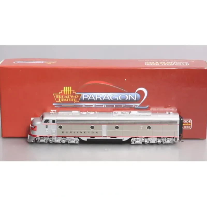This is a Broadway Limited 2356 HO Scale Chicago, Burlington & Quincy EMD E8A with Sound & DCC – Paragon2 #9967 (silver, red).Features ABS plastic body, heavy die cast chassis, precision gearing and 5-pole can motor with skew-wound armature. Handrails, ladders, horns, bells and more are separately applied.