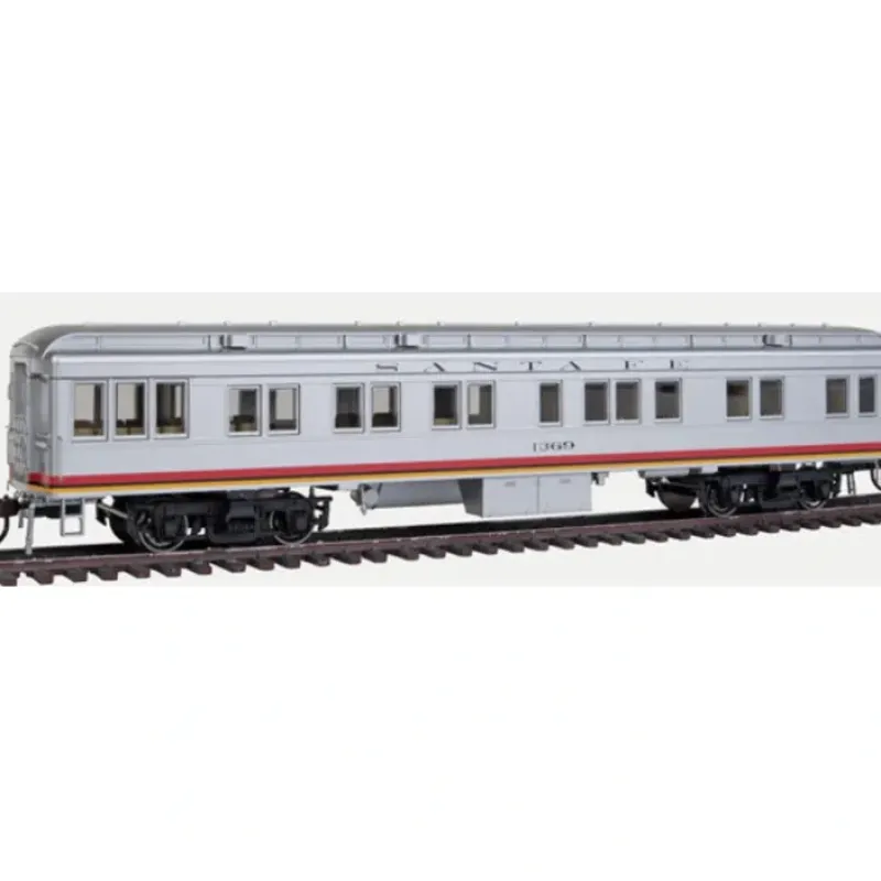 This is a Con-Cor 223-95201 HO Scale Heavyweight 65′ Branchline Solarium-Observation w/Lights – Ready to Run Santa Fe #1369 (Valley Flyer, silver, red, yellow) * Highly Detailed Car Body w/Separate Wire Handrails * Factory-Installed Interior Lighting Works on DC or DCC * Complete Underbody Details * Working Diaphragms * Scissors Gates at End Doors * Free-Rolling RP-25 Metal Wheels * Working Knuckle Couplers * Accurate Paint Colors * Complete Interior Details * Super-Detailed Trucks * Operates on 18 Radius Curve