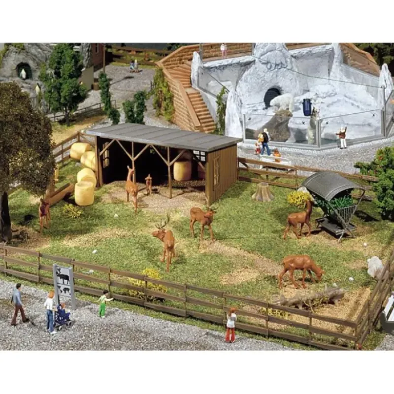 This is Faller 130564 Game Enclosure Red Deer. The package contains an outdoor enclosure with lattice fencing, an open shelter, a manger, fodder bales and a herd of red deer. An element that can also be used in some other way in parks. This building kit contains: 46 single parts in 3 colours, window foil, 1 decoration and 1 construction instruction.