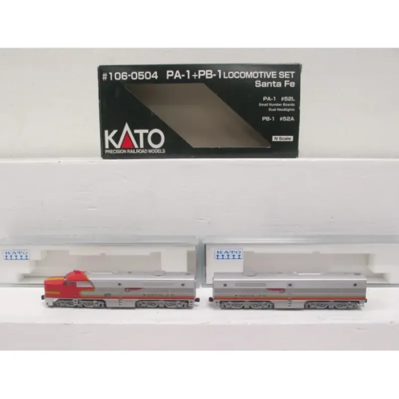 Here is a Kato 106-0504 Santa Fe PA1/PB2 Diesel Locomotive Set. These locomotives feature die cast frames, plastic shells, motor, plastic truck sides, fixed knuckle couplers, operating headlamp (A unit only), and metal wheels.