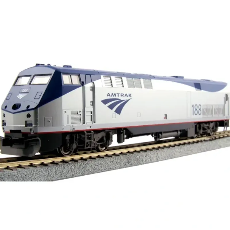 This is Kato 37-6103 HO P42 Amtrak PhVb #188. GE P42 ”Genesis” Amtrak Phase Vb #188. The General Electic P42 locomotive is also known as the ”Genesis” locomotive. The P42 is a modern 4200 horsepower passenger locomotive used across the United States and Canada. Amtrak’s P42 has replaced the EMD F40PH in revenue service and today they are used throughout the United States. Since their introduction, they have had a number of physical revisions to improve the ease of maintenance and parts replacements, including a bolt-on fiberglass nose panel (replacing the original’s solid metal which was difficult to repair or replace) and a new headlight bezel that is more rounded than the previous square versions.