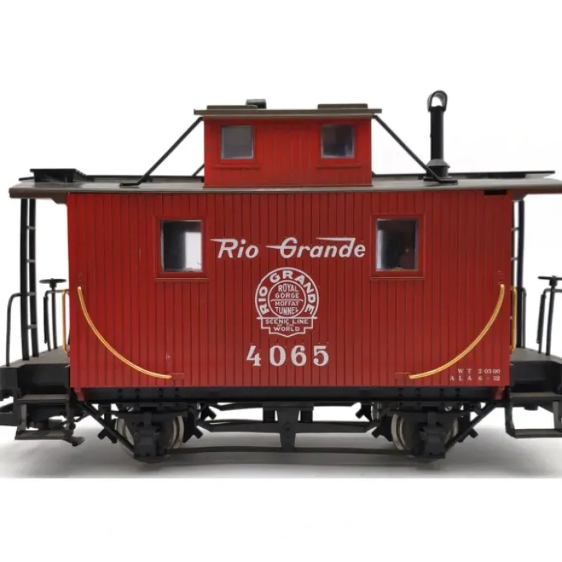 This is an LGB 4065 G Rio Grande Center Cupola Caboose. This caboose features plastic trucks, latch couplers, metal axles and metal wheels.