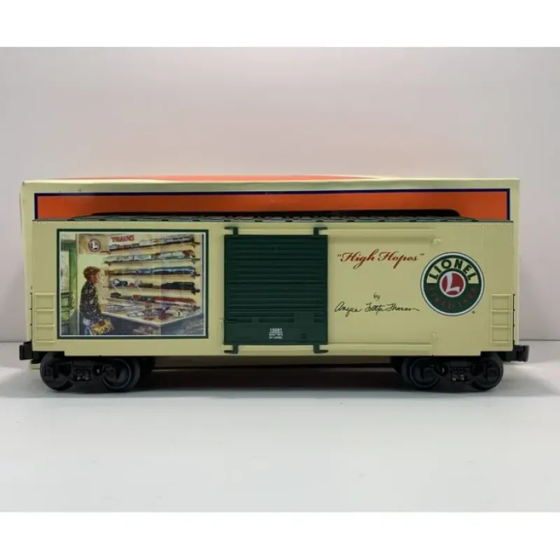 This is a Lionel 6-15091 O Gauge Angela Trotta Thomas “High Hopes” Hi-Cube Boxcar. Something Special for All Our Collectors. It’s the first Hi-cube style boxcar featuring the timeless art of Angela Trotta Thomas! The large side space on this modern boxcar is a perfect fit for a handsome rendition of her High Hopes painting. Christmas or any time of the year, her finely executed art touches all.