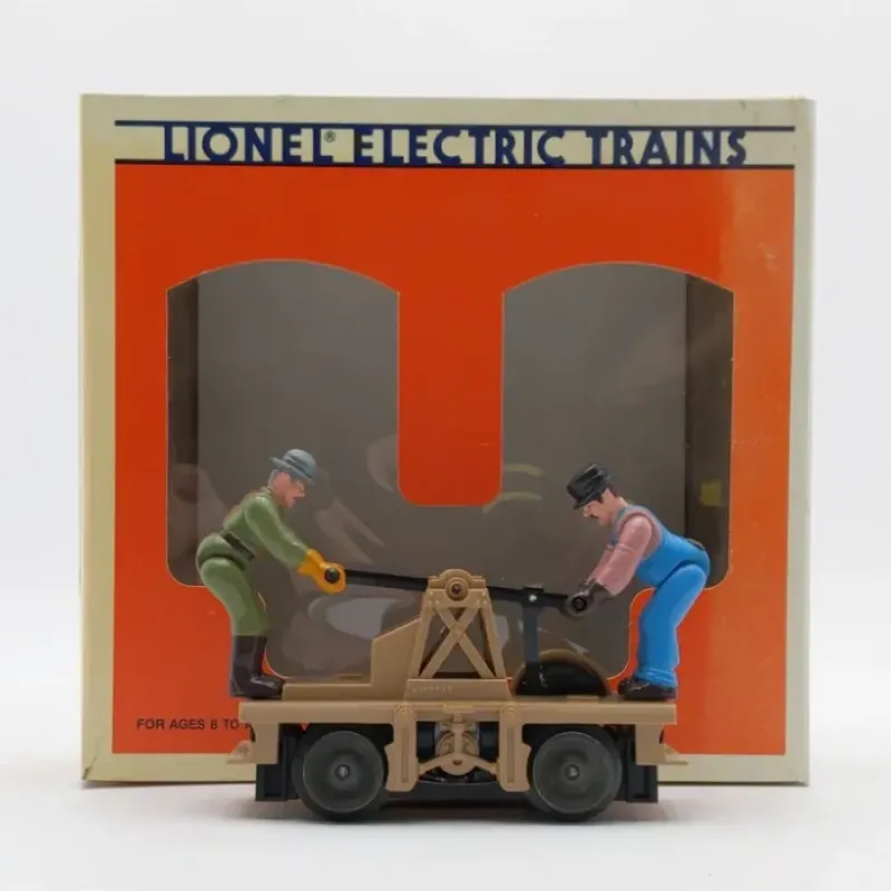 Here is a Lionel 6-18429 O Operating Handcar with Railroad Workers. It features articulated figures, a DC motor that runs on AC or DC power, and metal wheels and axles. The figures pump the handcar handle making it look like they are actually powering the car as it goes down the track.