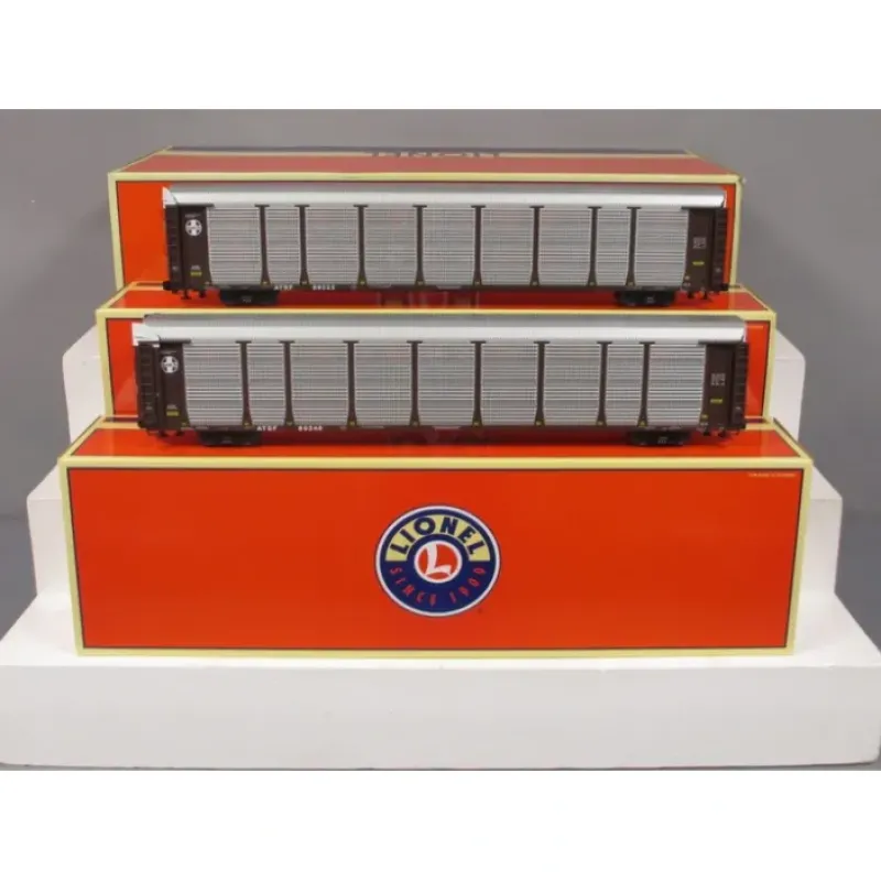 This is Lionel 6-29333 O SF Autorack Cars/2pk. Santa Fe auto rack 2-pack. Newly tooled 89 auto rack car. Like real auto carriers, the end doors on the carriers open to reveal a bi-level rack divider in the interior. You can even load these Auto Rack Cars with autos sold separately by Lionel.