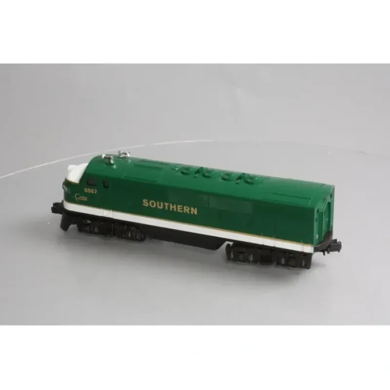 This is a Lionel 6-8567 O Gauge Southern F3 A Non-Powered Diesel Locomotive #8567 from 1975-77. Features include interior cab illumination, an operating headlight, self-centering couplers, and die-cast wheels and trucks.