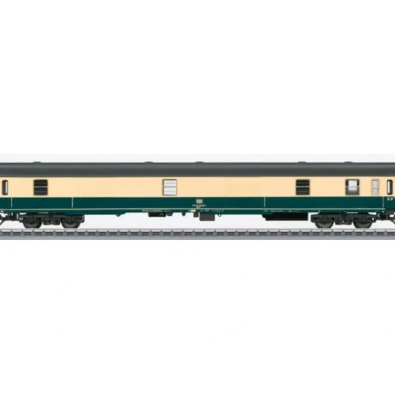 This is a Marklin 43960 HO Scale German Federal Railroad DB Type Dms 905.0 Baggage Car – 3-Rail – Ready to Run (Era IV, 1986, ocean blue, beige) Features detailed underbody specific to car type, trucks with disk brakes and separately applied generator.