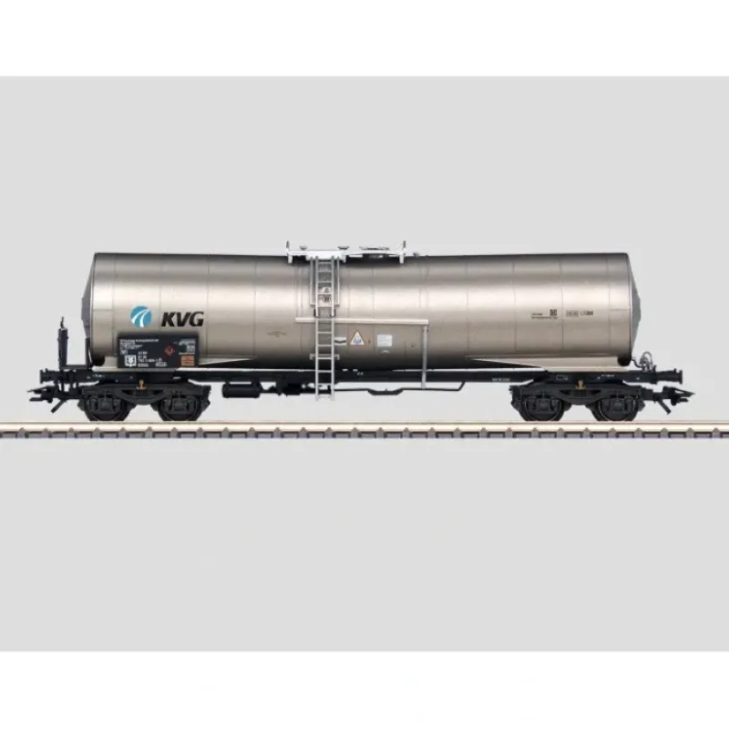 This is Marklin 47561 Tank Car DB AG KVG. Era V Germany, DB AG. Special car for chemical products, used on the German Railroad, Inc. (DB AG). Design with insulated funnel flow tank. Privately owned car painted and lettered for the car leasing company KVG Kesselwagen Vermietgesellschaft mbH.