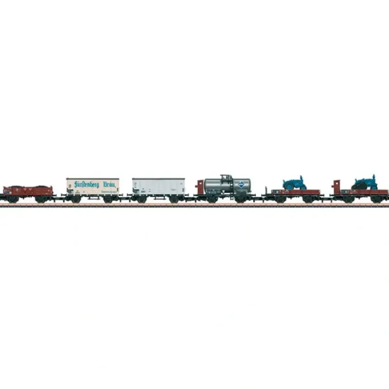 This is a Marklin, Inc 82338 Z Scale DB Freight 6-Car Set EX. Freight car set mixed freight train. Era III Germany, DB. German Federal Railroad (DB) freight car set consisting of six 2-axle freight cars. The train includes 1 type X05 low side car with a brakeman’s cab with a Lanz tractor as a load, 1 type X05 low side car with a brakeman’s platform with a Lanz half track tractor as a load, 1 tank car with a brakeman’s cab, painted and lettered for BV-Aral, 1 insulated boxcar, 1 beer refrigerator car painted and lettered for Furstenberg, and an Association type O 10 gondola with board walls, with a load of coal. Its key features are: Finely constructed with extensive, prototypical paint schemes and lettering Different car numbers Tractor models are constructed of metal and are each mounted on a load frame Gondola has a load insert of coal Length: over the buffers approximately 245 mm / 9-5/8 All of the models are a special edition and are not available separately.