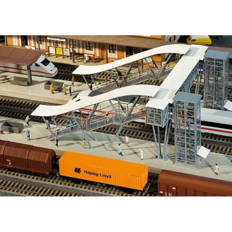 This is Faller 120110 Neustadt Pedestrian Brdg. Neustadt/Weinstrae Platform bridge. Faithful reproduction of the original footbridge built in Neustadt, to go with FALLER station Neustadt/Weinstrae 110111. Present-day steel and glass construction with two covered stairways, bridge spanning two tracks and two annexed elevator towers (without function). The width of both rising and descending flights of stairs annexed to the bridge can be modified according to a module to match any type of track. Several units can be built side by side. Suitable for catenary operation. Without platforms. Can be used with any type of FALLER platform. This building kit contains: 236 single parts in 3 colours, window parts and 1 construction instruction.