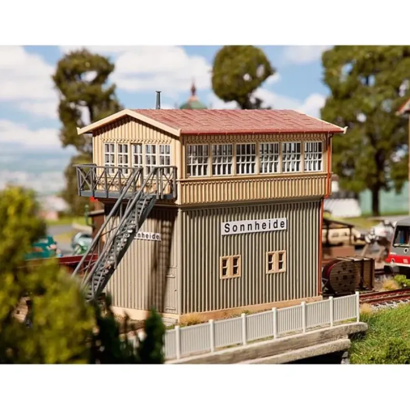 This is Faller 120115 Sonnheide Signal Tower. Signal box timber-frame construction with separate external staircase. This signal box is very versatile. It is supplied with extensive interior equipment. This building kit contains: 88 single parts in 6 colours, window foil, 1 paper mask, 1 decoration and 1 construction instruction.