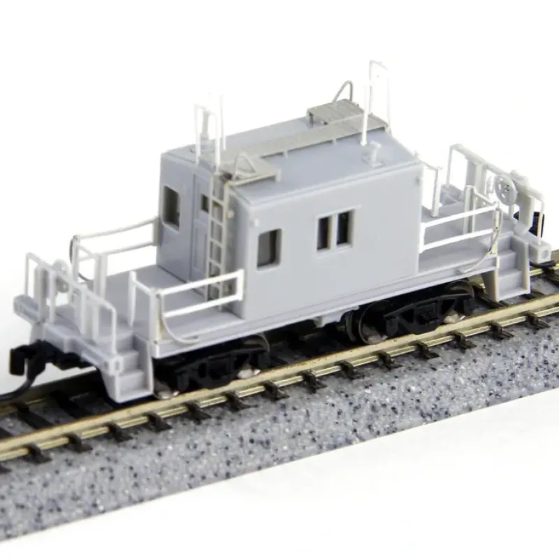 This is Fox Valley Models 91150 N Transfer Caboose, Undecorated. A transfer caboose looks more like a flat car with a shed bolted to the middle of it than it does a standard caboose. It is used in transfer service between rail yards or short switching runs, and as such, lacks sleeping, cooking or restroom facilities. The ends of a transfer caboose are left open, with safety railings surrounding the area between the crew compartment and the end of the car. This model features a finely molded body, etched metal and wire details, metal wheelsets, and knuckle couplers.