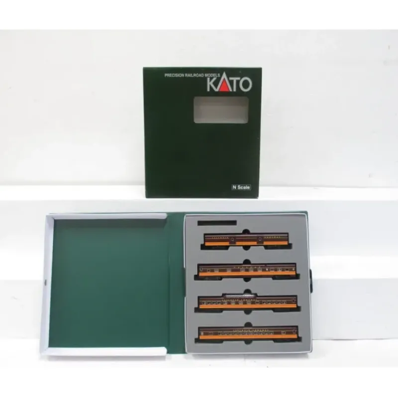 This is a Kato 10-6096 N IC Smoothside Passenger 4-Car Add-On Set. These cars feature plastic construction, plastic trucks, furnished interiors, knuckle couplers, and metal wheels. These measure approximately 6 inches in length.