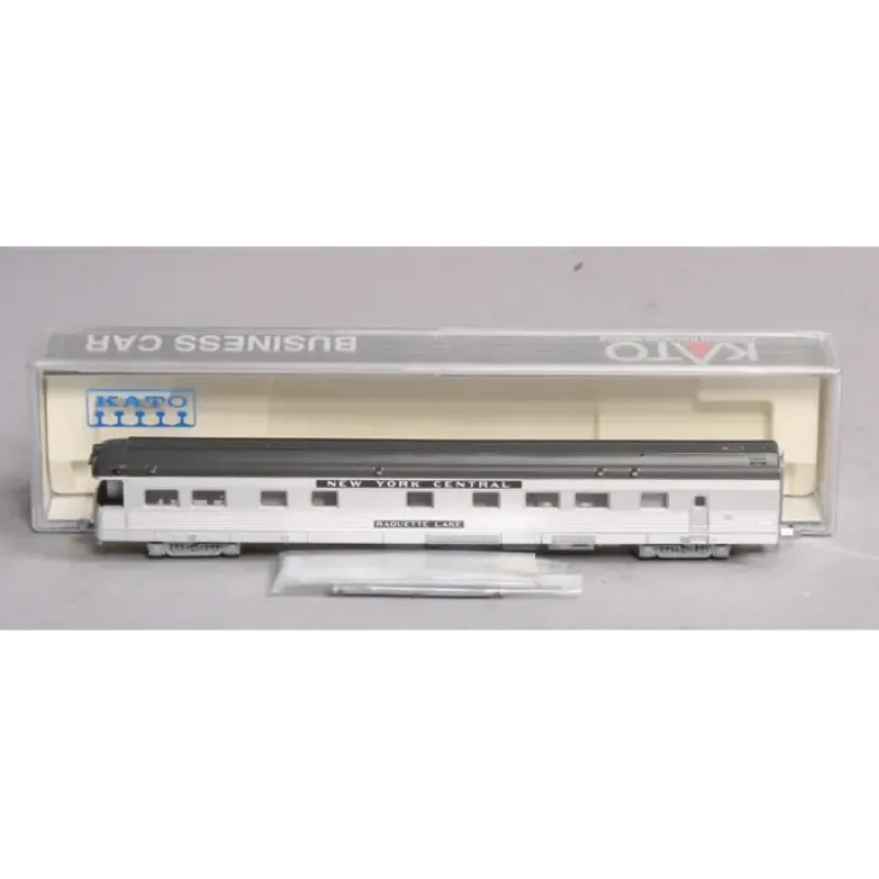This is a Kato 156-0812 N New York Central Raquette Lake Business Car. Also known as Private Cars, Business Cars have existed since the early days of railroading. They are generally self-contained with office, meeting room, track inspection, entertainment, dining and sleeping facilities on board for railway officials and their invited guests. Assigned to key railway personnel for the purpose of inspecting track and traveling on company business, these cars were often handled on the rear of a convenient regularly scheduled passenger run. Today, it is not uncommon to see them at the back of an Amtrak or freight train. Ready to Run. Blackened Metal Wheels. Simulated Corrugated Metal Siding. Interior Lighting Available (Kit #11-209 or #11-210 Sold Separately). Interior Detailing. Rapido Coupler on Front of Car (Replacement Knuckle Coupler Sold Separately). Knuckle Coupler on Rear of Car. Finescale Detailing