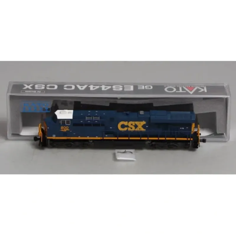 This is Kato 1768915 N CSX GE ES44AC Gevo w/ DCC Installed #800. Features: Updated paint scheme from previous runs with additional warning labels and printing, Nose Headlight and low numberboards, Powerful Kato mechanism powered by a 5-pole flywheel motor and featuring a 9 3/4 minimum turning radius., Directional Headlight and illuminated, preprinted numberboards., Illuminated ditch lights., DCC Friendly mechanism ready for drop-in decoder installation.