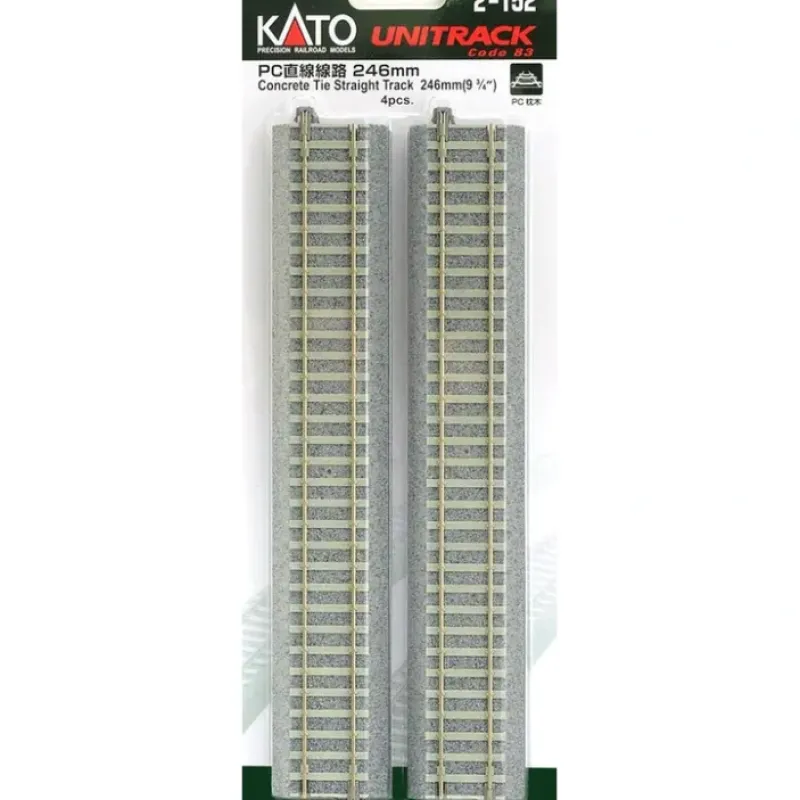 This is a Kato 2-152 HO Scale 9-3/4 Concrete Tie Straight UniTrack (Pack of 4). The next stage in realistic snap track – Superelevation is the term used to describe track in which one rail is higher than the other; much like a banked curve on a freeway offramp or a high speed corner in NASCAR, these banked curves are specially designed to reduce wheel wear and increase both comfort and safety in all manner of trains, fast or slow, passenger and freight. Previously available only in N Gauge as part of Kato’s double track line, these curves are now making their way to the HO UniTrack line, along with the modern appearance of Concrete ties for the most realistic looking model railroading experience yet! Just like with its N Gauge counterparts, this new series of HO Gauge tracks are 100% compatible with existing HO Gauge UniTrack layouts using wooden tie track!