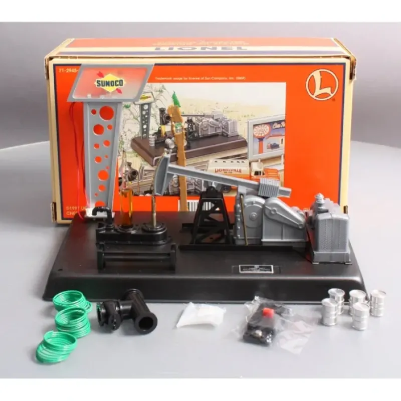 Here is a Lionel 6-12945 Sunoco Animated Pumping Station #457. This Lionel accessory captures the action of a real-life petroleum pumping station. It features an animated walking beam, oil pump, oil drums, and an incredible illuminated wellhead simulation of flowing crude oil.