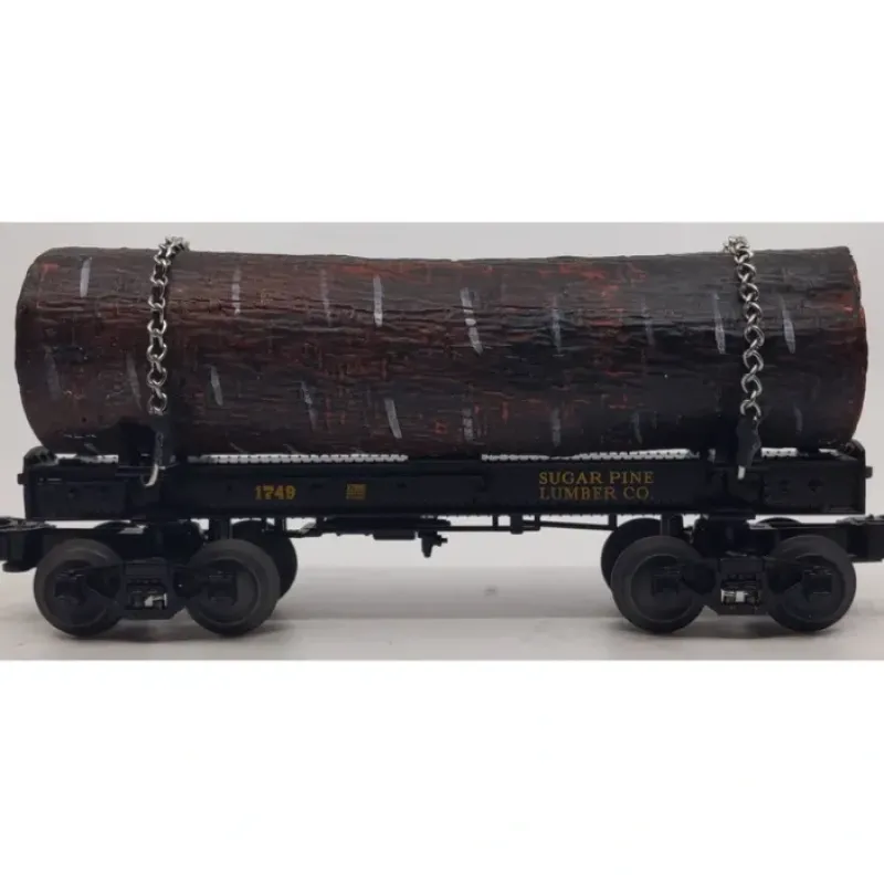 Here is a Lionel 6-27860 O Gauge Sugar Pine Lumber Skeleton Car #1749 with Log. This skeleton car features die-cast metal sprung trucks, die-cast metal operating knuckle couplers, a die-cast metal body, authentically detailed brake rigging and air cylinder, removable realistic simulated wood log attached to the car with two metal chains, metal wheels and axles, and attractive decoration. Dimensions: Length: 9 Minimum Curve: O-31.