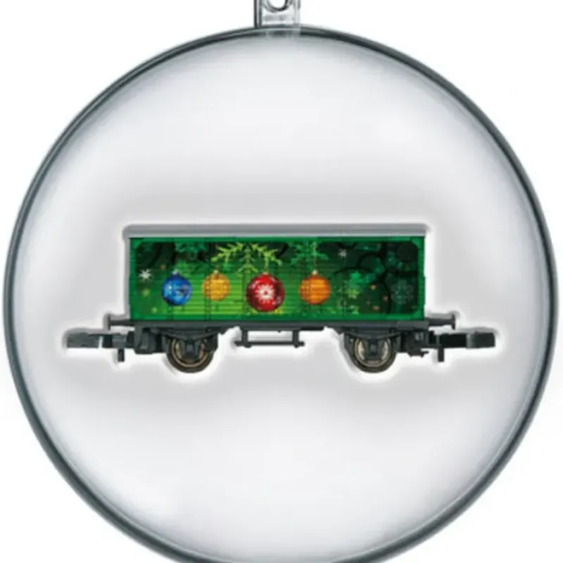 This is a Marklin 80624 Z Scale Christmas Car Type A2 Wood Reefer Ready to Run 2014 (green w/Ornaments). This wooden reefer is adorned with colorful ornament graphics on a green field of snowflakes. The car comes packaged in a clear ball-style Christmas ornament complete with cord for hanging it on the tree.