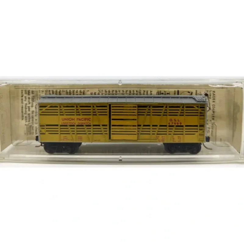 This is a Micro-Trains 03500010 N Scale Union Pacific Stock Car #47999. It features plastic construction, plastic wheels and axles & has knuckle couplers.