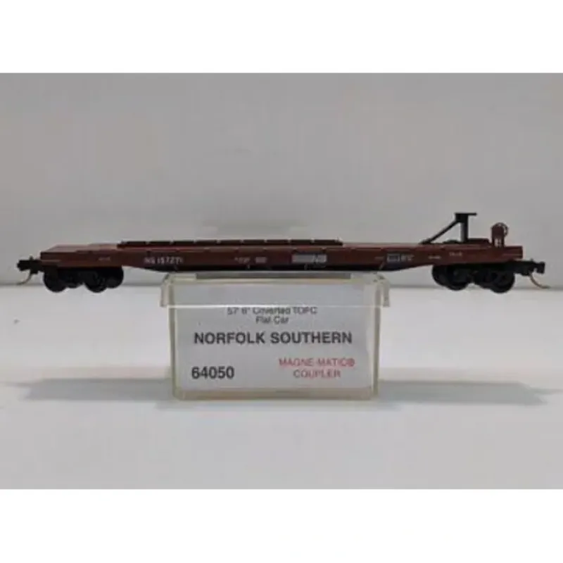This is MicroTrains 6400050 57’6 TOFC Flat NS 157342. 57′ 6 TOFC intermodal flatcar, ready to run. Southern Railway #157342 (boxcar red). This item features a plastic construction with plastic trucks, plastic wheels, and Kadee couplers. Built in June 1987 and runs the Southern District on roller bearing trucks. This single hitch TOFC car was originally built as a boxcar in the late 1950s. In the 1980s it was converted to an intermodal car; then again in the early 1990s it was refurbished and renumbered into its present NS 157000 series.
