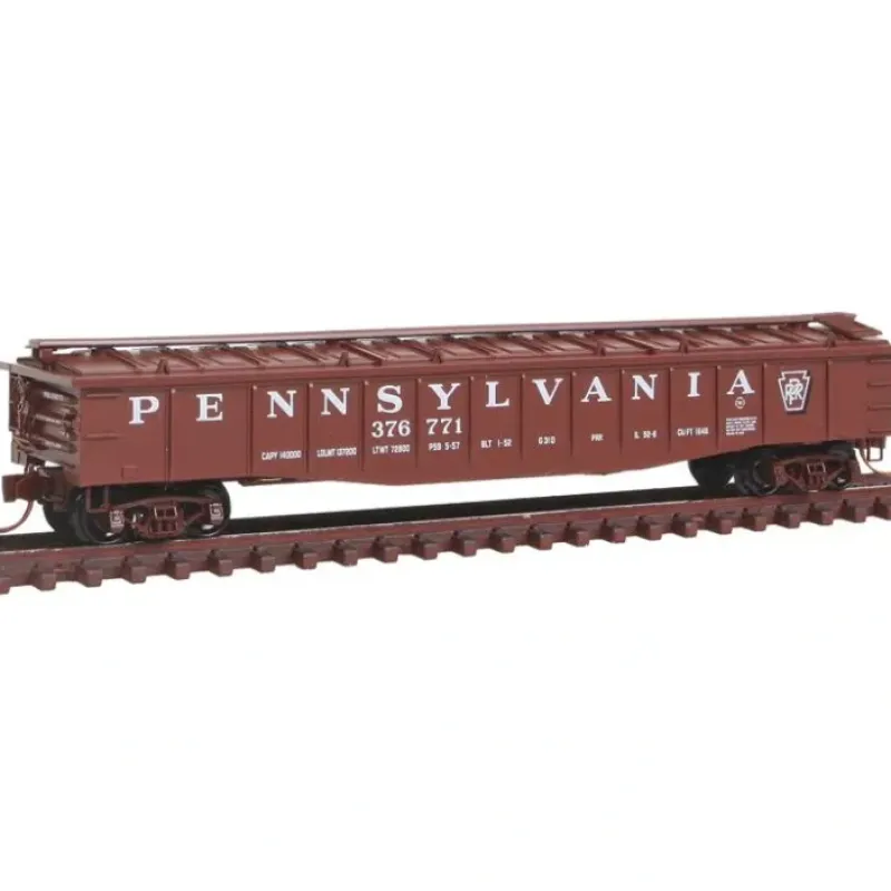 Here is a Micro-Trains 10600080 N PRR 50′ 14 Panel Steel Side Gondola w/Cover #376771. This car features a plastic construction, plastic trucks, plastic wheels and axles, and knuckle couplers.