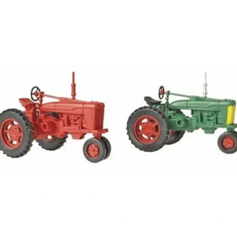 Pair of HO Scale Tractors from the Scene Master Series by Lifelike Trains. Features: One red plastic International Harvester-type tractor, One green John Deere-type tractor, Tractors are extremely detailed, Rolling black tires and steerable front wheels, Authentic HO scale, Intricate molding, Hand painted details, Adds authenticity to any scene, Carded packaging. Includes: Two HO Scale Tractors. Scale: HO 1/87. Length: 1-5/8 (4.1cm). Width: 7/8 (2.2cm). Height: 1-1/8 (2.9cm).