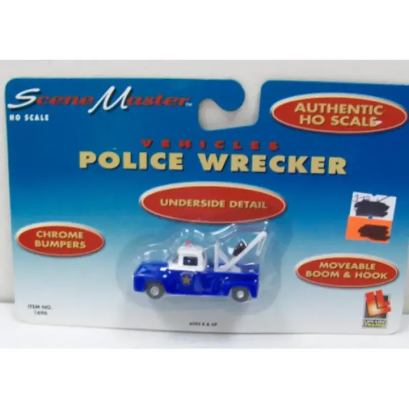 This is a Life-Like 1696 HO SceneMaster Series Police Wrecker. Suitable for Ages 8 & Older. Features: Authentic HO scale model with a 1950’s molded body style, Fully painted and decorated, Movable boom and hook, Separately applied detail parts including chrome bumper, Interior detail, Molded chassis detail. Includes (1) Vehicle. Scale: HO 1:87. Length: 2-3/8 (60mm). Width: 1 (25mm).
