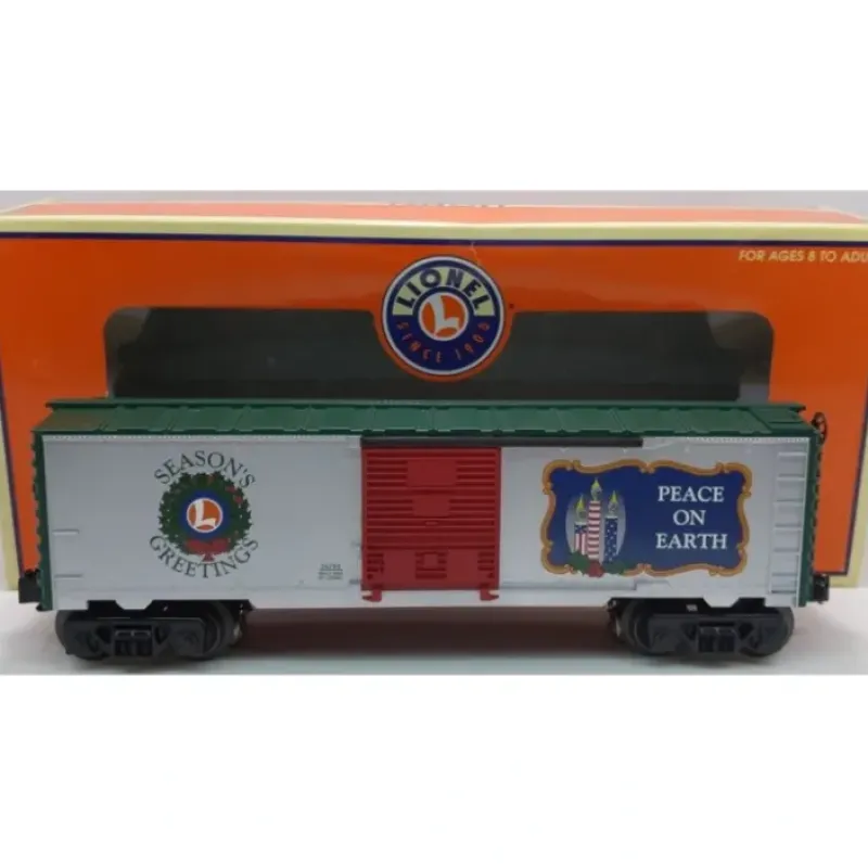 Here is a Lionel 6-26790 O Gauge Lighted Christmas Boxcar. It has twinking lights on the sides of the car when power is applied. This car features die-cast metal sprung trucks, die-cast metal operating knuckle couplers, and metal wheels and axles.