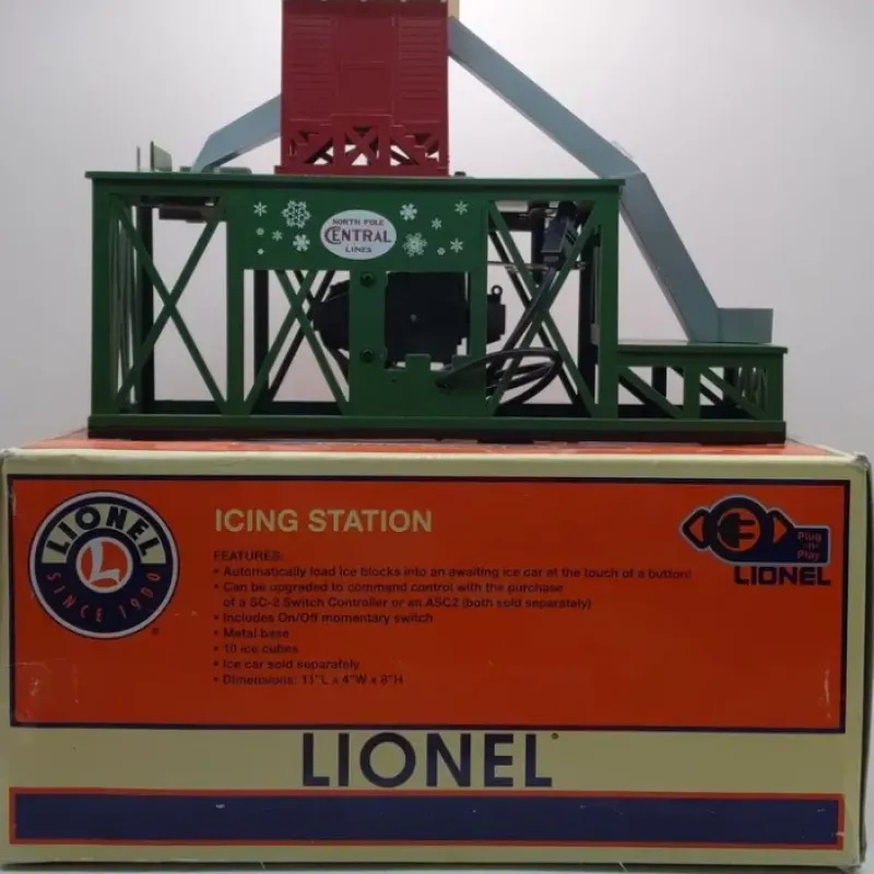 This is a Lionel 6-82051 O North Pole Central Operating Icing Station Kit. There’s no shortage of ice at this North Pole station to load into incoming refrigerated boxcars. Watch as the festive figure pushes the ice cubes from the chute down to the awaiting ice car (sold separately). Position the ice car at the platform, and load it up. Operate this accessory on any traditional AC or DC powered O/O27 or FasTrack layout. Features: Ice blocks are loaded into the house manually, then sent down the station chute, metal base, includes 10 ice blocks, ice car sold separately. Plug-n-Play accessory connect easily to FasTrack with a Plug-n-Play Lock-on (6-81313, sold separately). You can also connect to a traditional tubular O/O27 track lock-on or to an accessory power supply (both sold separately). Can be upgraded to command control with the purchase of a SC-2 Switch Controller or an ASC2 (both sold separately).