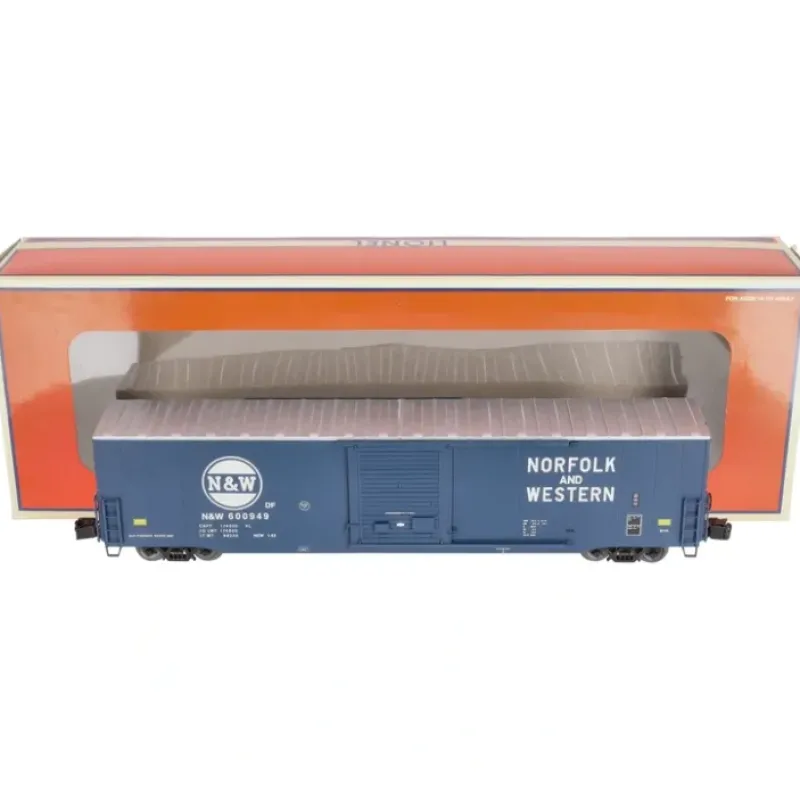 This is a Lionel 6-82660 Norfolk & Western 60′ Single-Door Boxcar #600949. In the 1960s, 50 and 60 boxcars became common sight on the rail lines replacing many aging boxcar fleets of the past. Commonly seen hauling heavier autoparts, these 60 cars can be used in many roles. Use them in a general freight train, or with the new Lionel 86 boxcars and scale autoracks to serve an auto assembly plant. Features includes die-cast metal sprung trucks and operating couplers with hidden uncoupling tabs, rotating bearing caps on trucks, separately applied metal underframe and body details, opening doors.