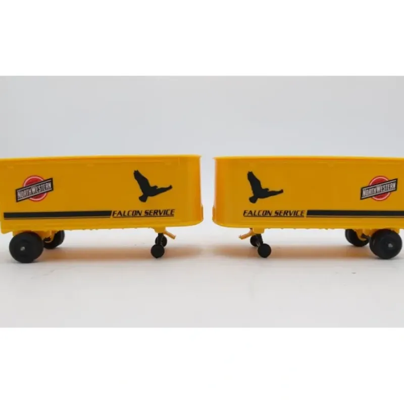 Here are 2 Lionel 6-9352 O Gauge Chicago & Northwestern Falcon Service Trailers. The trailers feature full plastic construction with rubber wheels.